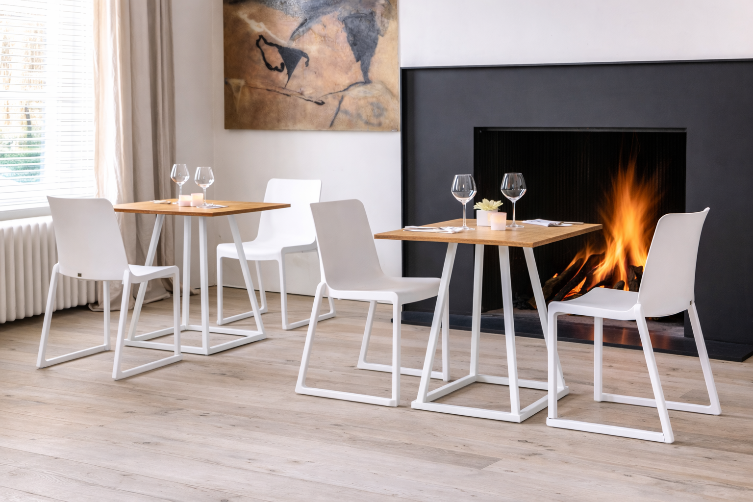 Deze stijlvolle vierkante Linea zittafel met houten blad en wit metalen onderstel is perfect voor diners, lunches en gezellige zitmomenten. De combinatie van natuurlijke en moderne materialen zorgt voor een frisse en luxe uitstraling op ieder evenement.