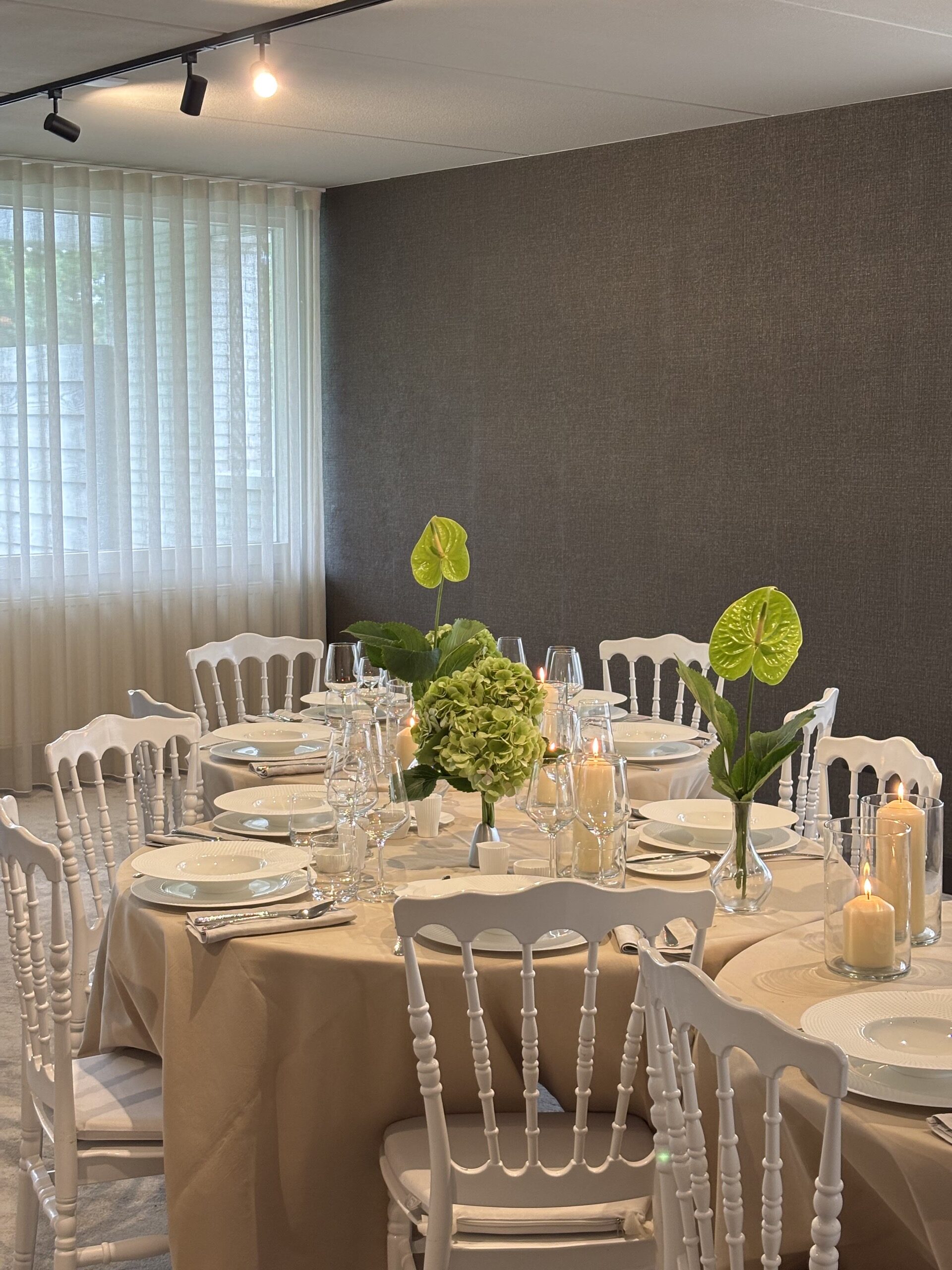 Je hebt de keuze om de tafel zelf te dekken met de door ons geleverde materialen, óf om je volledig te laten ontzorgen. In dat geval komen wij de tafel op locatie stylen, zodat jij alleen nog hoeft aan te schuiven en te genieten van een prachtig verzorgde setting.