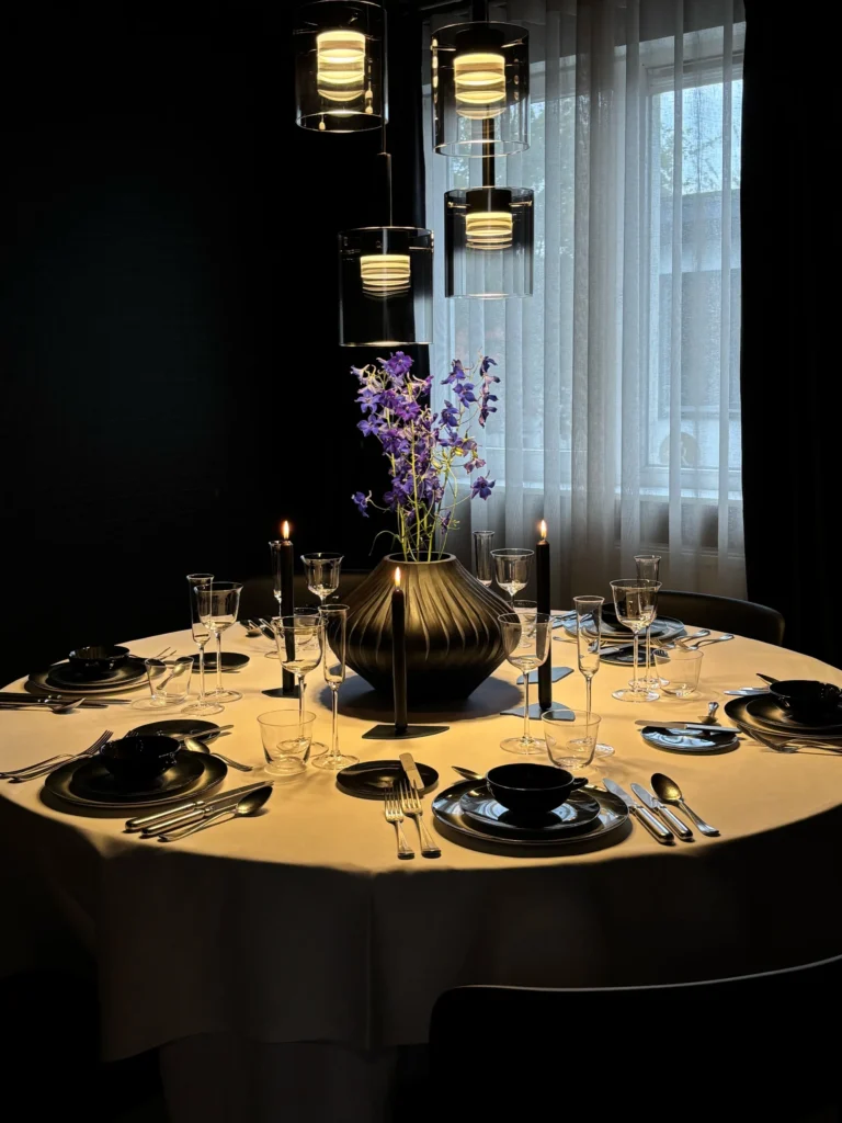 Het servies wordt gecombineerd met tafellinnen, glaswerk, kaarsen en bloemen, zodat alles een mooi geheel vormt.