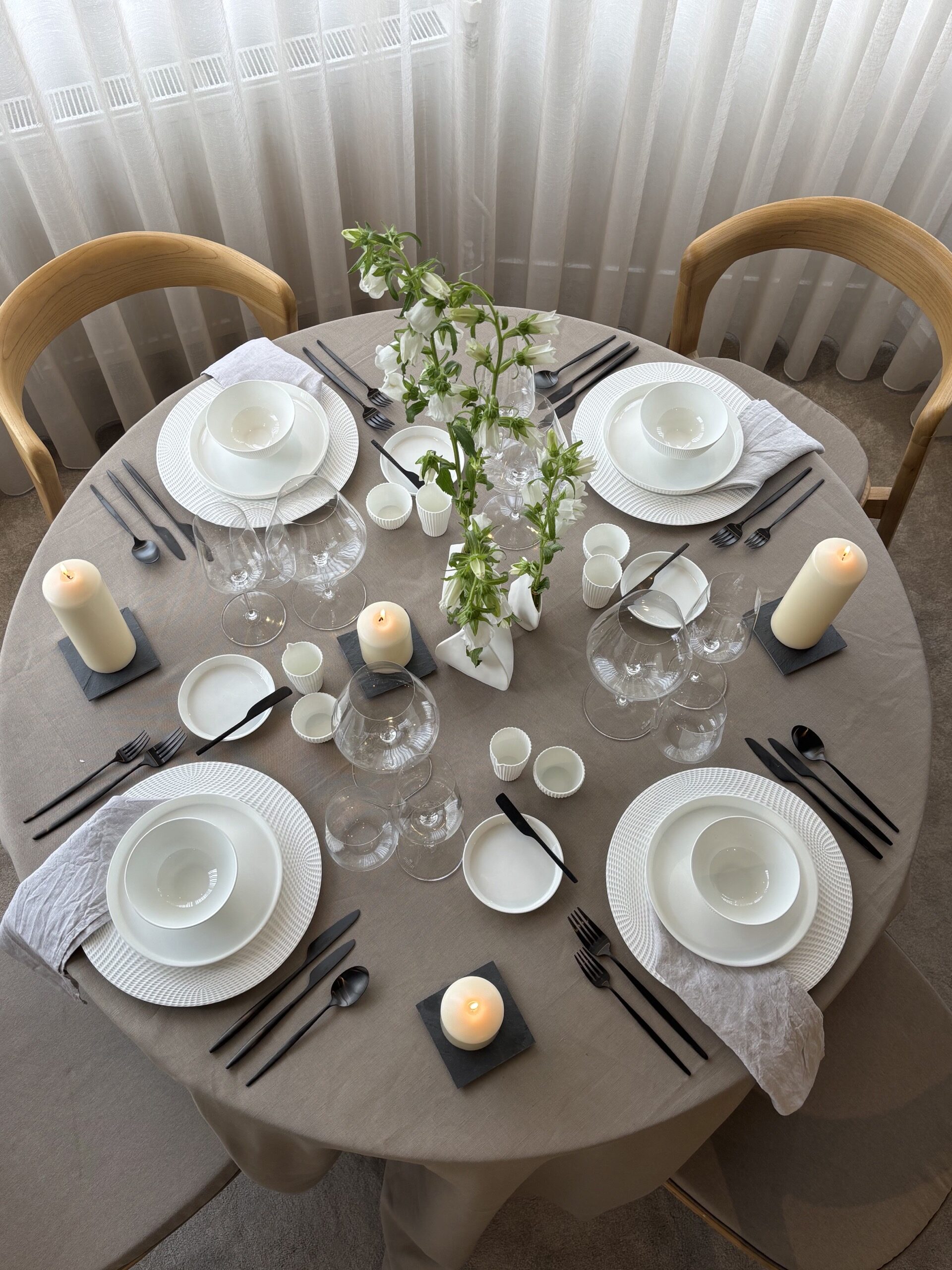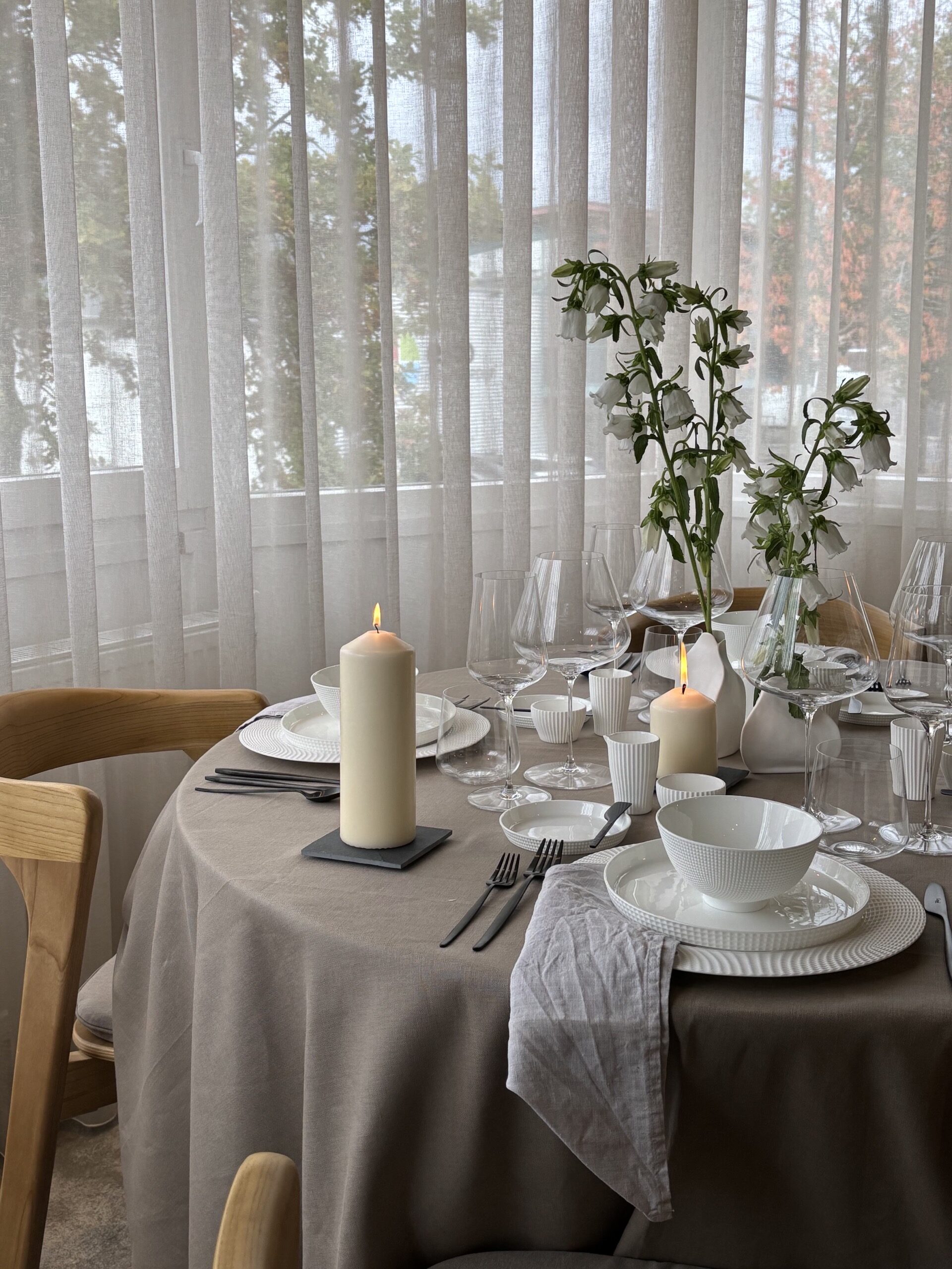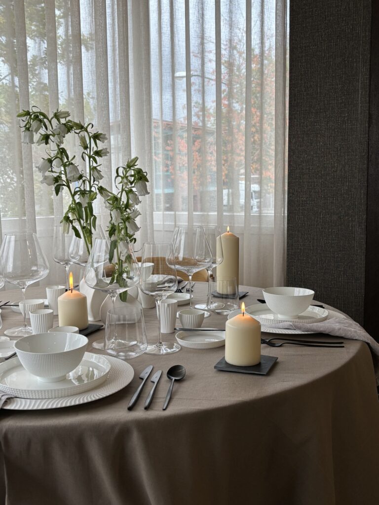 Het servies wordt gecombineerd met tafellinnen, glaswerk, kaarsen en bloemen, zodat alles een mooi geheel vormt.